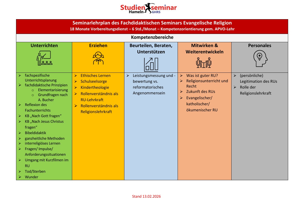 Die Ausbildung in unserem Fachseminar orientiert sich an einem kompetenzorientierten Religionsunterricht, bei dem die Lebenswelt der Schülerinnen und Schüler im Zentrum der Planung und Durchführung von Unterricht steht. Sie als Anwärterinnen und Anwärter erfahren Unterstützung bei einer Weiterentwicklung Ihrer theologisch-religionspädagogischen Kompetenzen, um in Ihrem Religionsunterricht den Schülerfragen fach- und schülergerecht sowie lernwirksam begegnen zu können.