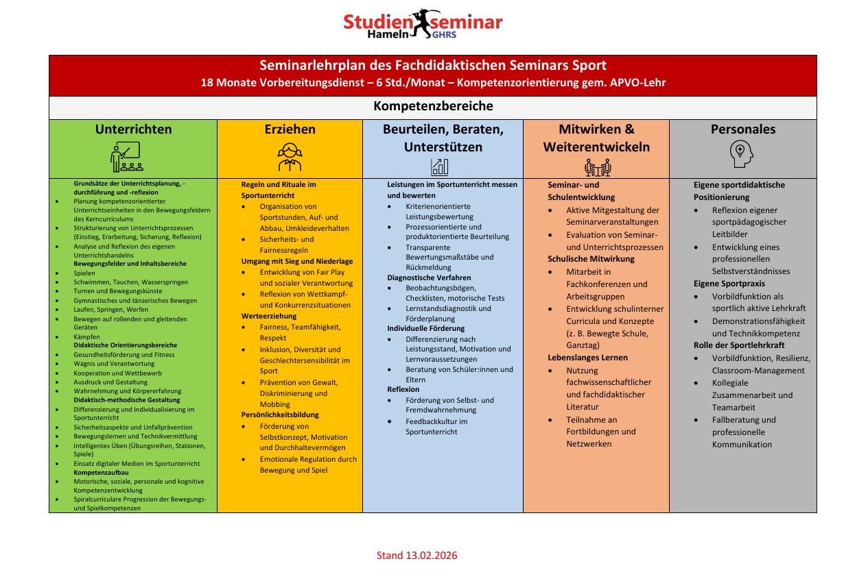 Mein Name ist Eric Seifert und ich unterstütze Sie dabei, ansprechenden, vielseitigen und lernwirksamen Sportunterricht zu planen, durchzuführen und zu reflektieren. Im Fachseminar Sport werden in der Regel bis zu zwölf Lehrkräfte im Vorbereitungsdienst zur Sportlehrkraft an der Grundschule und der SEK I ausgebildet. In den Seminarveranstaltungen wird neben der Bearbeitung von theoretischen Inhalten (Didaktik und Methodik des Sportunterrichts) möglichst viel Praxis zu ausgewählten Schwerpunkten betrieben. Zudem führen wir in unregelmäßigen Abständen gegenseitige Unterrichtsbesuche durch. Jeweils zu Beginn eines Ausbildungshalbjahres wird eine Planung der Seminarthemen gemeinsam abgesprochen. Die Themen leiten sich aus dem Seminarlehrplan ab und Sie sind eingeladen, sich mit Ihren Kompetenzen in die Seminararbeit einzubringen.